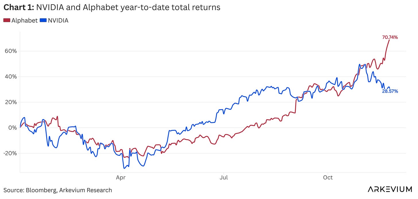 The headline number tells part of the story. Alphabet is up 70.74% YTD. Nvidia, for context, is up 28.57% over the same period (chart 1).